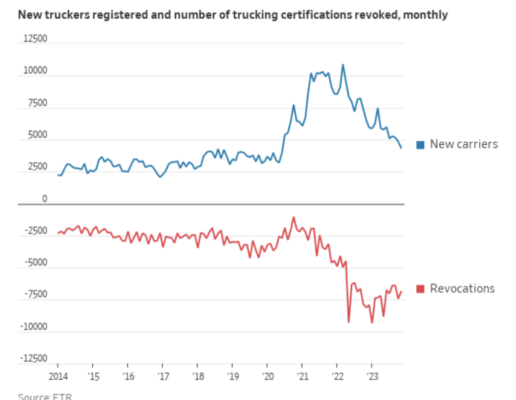There is still real pressure on freight rates. According to Uber Freight, carriers look for an increase in the first round of negotiations. That increase has gone by round 2. As you can see, carriers are leaving the business faster than new entrants, leading to fewer available carriers in the market.